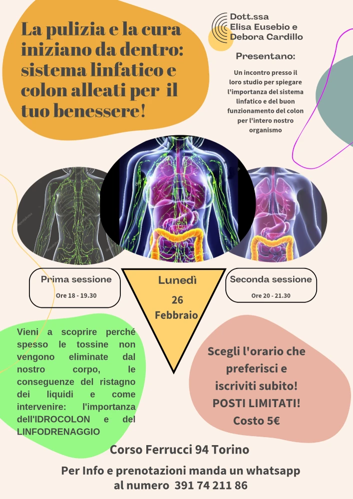Un incontro per spiegare l’importanza del sistema linfatico e del buon funzionamento del colon per l’intero organismo, per comprendere perché spesso le tossine non vengono eliminate dal corpo, provocando come conseguenza il ristagno dei liquidi e per capire come intervenire.